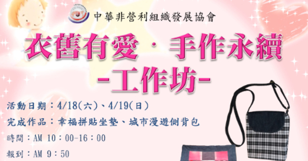 【台北衣藝】衣舊有愛・手作永續工作坊指導單位:台北市政府社會局主辦單位:中華非營利組織發展協會協辦單位:台北市萬華大理國小、彤宥縫紉工作室、台中市德明慈善會活動日期:4/18(六)、4/19(日)完成作品:幸福拼貼坐墊、城市漫遊側背包時間:AM 10:00-16:00報到:AM 【台北衣藝】衣舊有愛・手作永續工作坊指導單位:台北市政府社會局主辦單位:中華非營利組織發展協會協辦單位:台北市萬華大理國小、彤宥縫紉工作室、台中市德明慈善會活動日期:4/18(六)、4/19(日)完成作品:幸福拼貼坐墊、城市漫遊側背包時間:AM 10:00-16:00報到:AM 【台北衣藝】衣舊有愛・手作永續工作坊指導單位:台北市政府社會局主辦單位:中華非營利組織發展協會協辦單位:台北市萬華大理國小、彤宥縫紉工作室、台中市德明慈善會活動日期:4/18(六)、4/19(日)完成作品:幸福拼貼坐墊、城市漫遊側背包時間:AM 10:00-16:00報到:AM